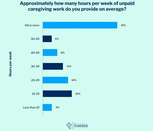 In the survey, 94 per cent of respondents either agreed or strongly agreed that they were often physically or mentally exhausted due to their responsibilities as a caregiver. It was hardly surprising with more than 40 per cent providing 60 hours of unpaid caregiving work or more every week, and another 13% above the typical 38-hour work week threshold.